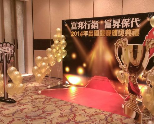 將頒獎典禮必備的紅毯大道設計在背板中央,利用金黃的光束與光暈營造聚光燈打在紅毯的效果,背板前搭配麥克風造型的割型立牌與大獎盃造型立牌,除了增加視覺的豐富度,也讓整個頒獎典禮增添了趣味性!!提升活動的熱鬧氣氛~