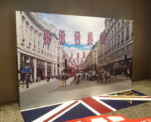 以英倫風為設計主軸,將主視覺背板設計可愛的英倫巴士~還有英國街頭為背景的拍照背板,地貼還特地用了英國的國旗,